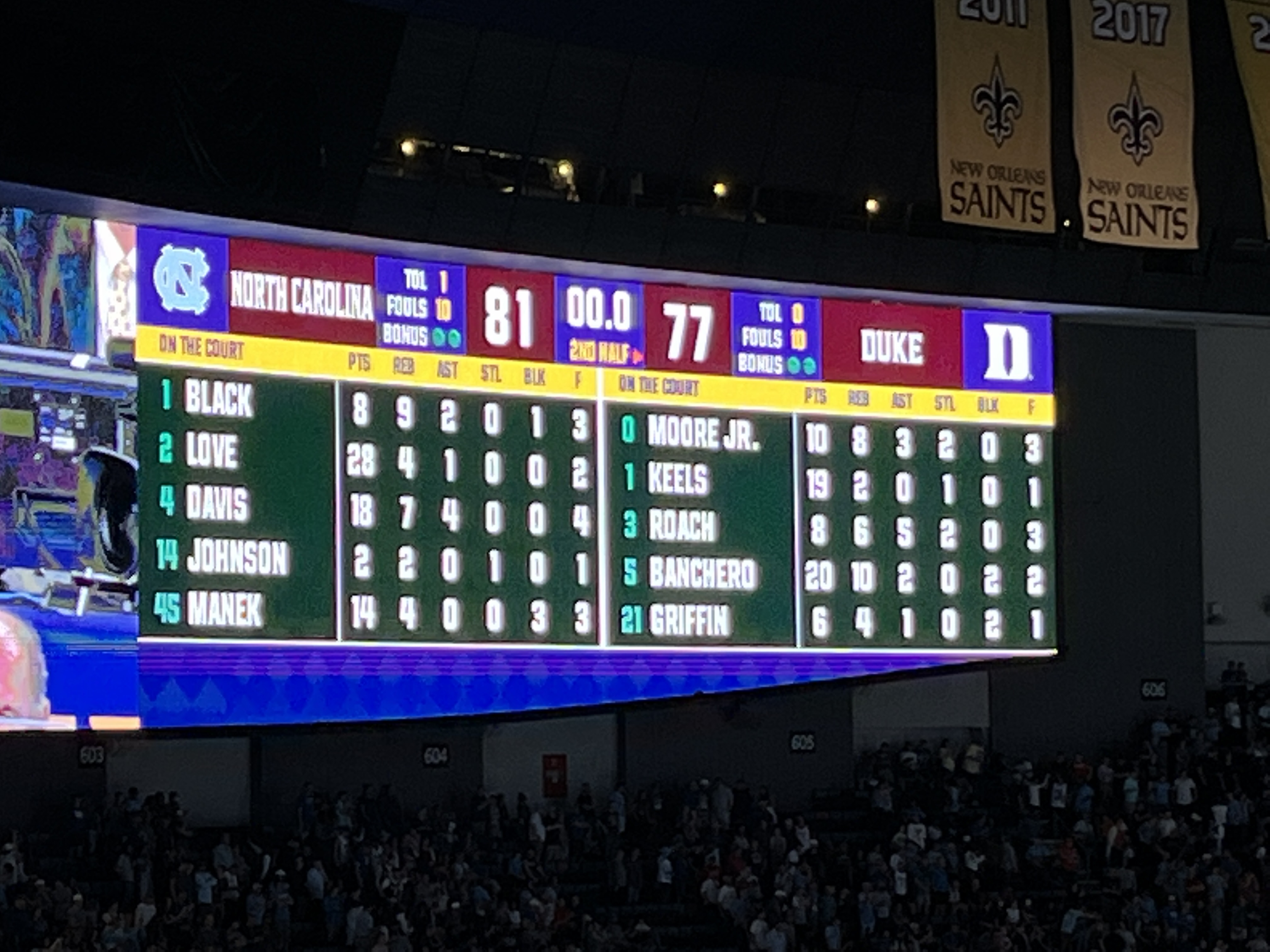 After arriving to the Superdome (around 6pm CST), JD and I took some cool photos, went inside, then stood in line for basically 4 hours to get food/water. Maybe that was an exaggeration, but it did take a long time. We arrived to our seats as the first game was ending. There was a sea of fans all around us, some of which we could not identify as being on our side. It turned out we were technically on the Duke side. No worries! We made new friends right next to us who happened to be Carolina fans. Then the game of a lifetime began. The rest is history.