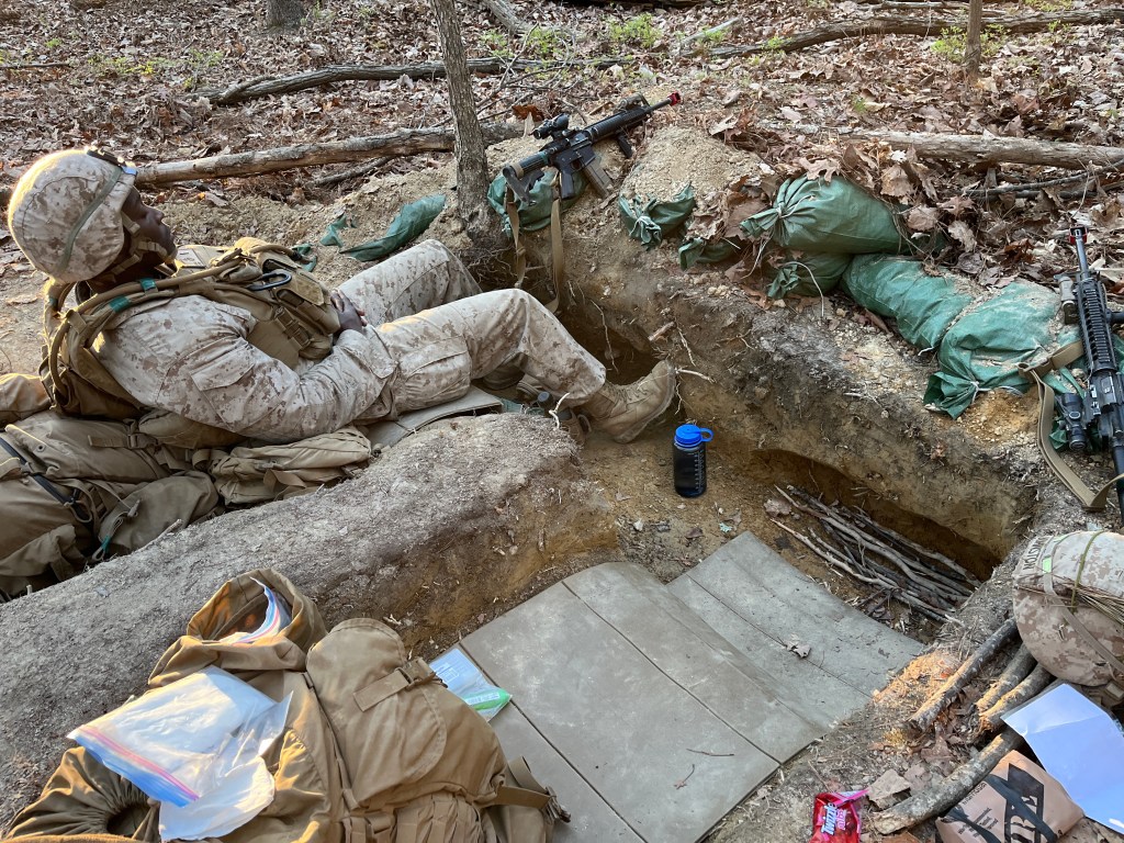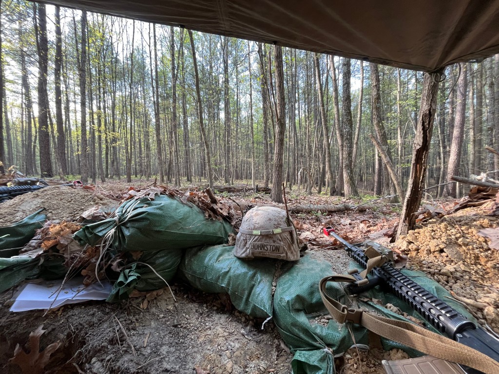 We did it. After several days in the woods, living in a hole, and trekking all over creation, we have finally made it back from the field. The event we were executing was called FEX II (Field Exercise). The purpose of FEX II was to implement platoon level skills and work as a team to play “war” with the other platoons. Although it wasn’t necessarily a great time overall, we had favorable weather and proved that our platoon makes a great team as we dominated the battle space.